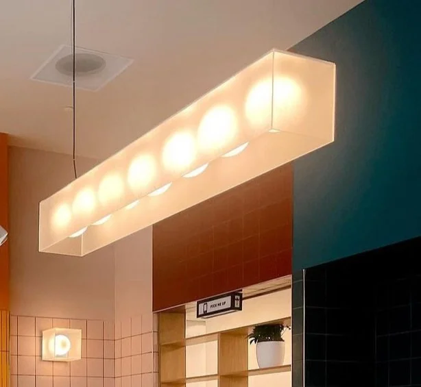 Custom linear LED fixtures designed with Riscala Agnese Architects. One 14’ and one 20’ long fixture illuminate the dining area of East/End. Lamped with linear LED bulbs