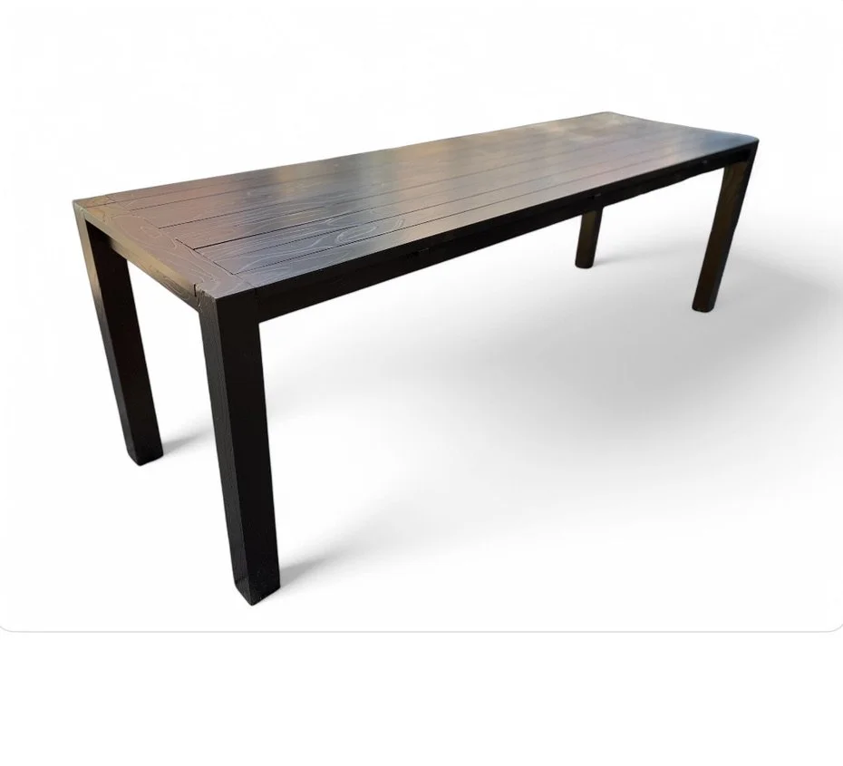 KnotWood outdoor Parson’s Table with dark copper powder finish.